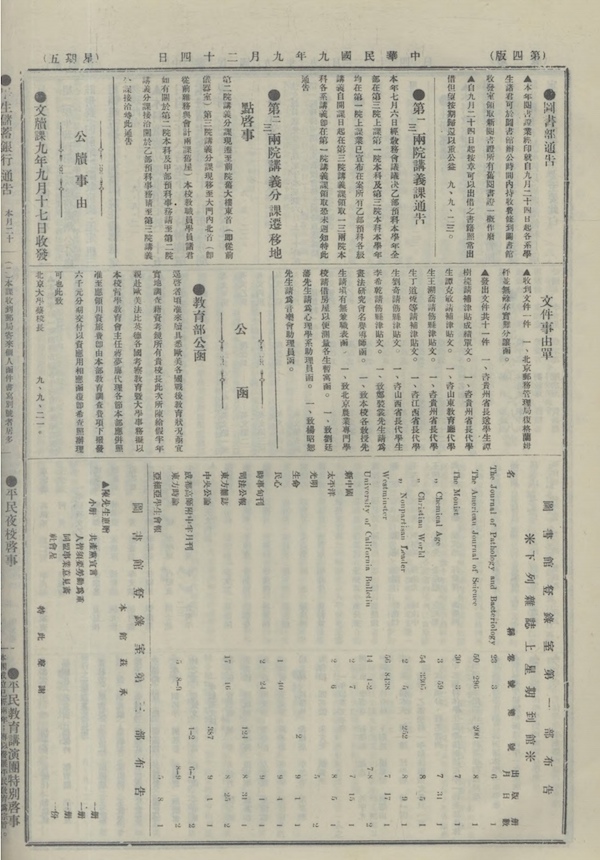 筆者在查考資料過程中,偶然發現1920年9月24日《北京大學日刊》第四版上,載有一則北大圖書館發布的校內公告,雖極為簡短,但不由令人眼前一亮。