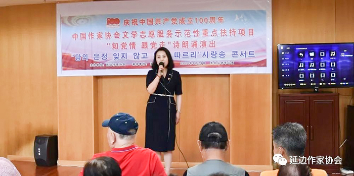 近日,由延邊作家協會主辦、詩朗誦協會承辦的“知黨情?跟黨走”詩歌朗誦演出在長白山敬老院開展。活動開始后,延邊作協黨組書記、主席鄭風淑和黨組成員、副主席李惠淑親切慰問金哲等離退休老同志、老作家、向他們致以問候和祝福并為他們送上鮮花,對他們為朝鮮族和延邊文學做出的貢獻表示感謝。在詩朗誦《太陽城》中,演出正式拉開序幕。隨后,詩劇《革命者的妻子》《祖國,我永恒的保姆》、詩朗誦《祖國啊,我親愛的祖國》、舞蹈《金達萊》等節目將演出推向高潮,贏得了老人們的陣陣掌聲。