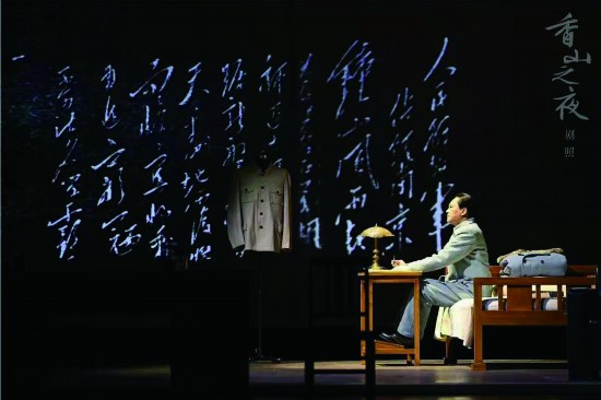 大幕拉開,扮演毛澤東的演員王斑為了練習湖南口音,朗讀了一段毛澤東在1954年中華人民共和國第一屆全國人民代表大會第一次會議上的開幕詞;全劇結尾,站在桌子后面的“毛澤東”面對臺下的觀眾,伴著強有力的形體動作,再次讀出這段令人熱血沸騰的宣言:“我們的事業(yè)是正義的。正義的事業(yè)是任何敵人也攻不破的。領導我們事業(yè)的核心力量是中國共產(chǎn)黨。指導我們思想的理論基礎是馬克思列寧主義。我們有充分的信心,克服一切艱難困苦,將我國建設成為一個偉大的社會主義共和國。我們正在前進。我們正在做我們的前人從來沒有做過的極其光榮偉大的事業(yè)。我們的目的一定要達到。我們的目的一定能夠達到。”可以說,這段話不啻為這部戲的戲核。香山的那一夜是繼往開來的一個重要時間節(jié)點,正如習近平總書記所強調的:歷史充分證明,中國共產(chǎn)黨和中國人民不僅善于打破一個舊世界,而且善于建設一個新世界。展望未來,中國的發(fā)展前景無限美好。