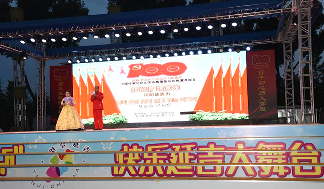 為慶祝中國共產黨成立100周年,學習貫徹習近平總書記“七一”重要講話精神,激發奮進力量,7月7日晚,中國作家協會2021年文學志愿服務示范性重點扶持項目——“知黨情 跟黨走”詩歌朗誦演出在延吉青年廣場“延吉快樂大舞臺”舉行。延邊詩朗誦協會詩歌朗誦藝術家及詩朗誦愛好者、延邊大學學生等70多人參加詩歌朗誦演出,為廣大市民獻上一場文學盛宴。