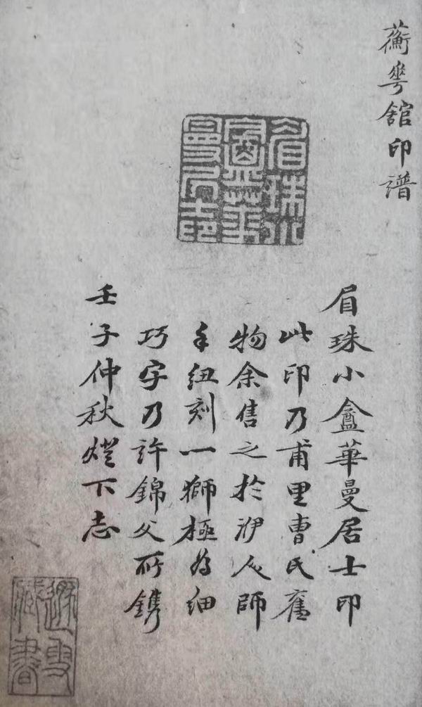 王韜日記中保留諸多本人的印章信息,僅臺(tái)灣傅斯年圖書館所藏《蘅華館雜錄》六冊(cè),就保存王氏“蘭卿”“蘅華館主”“家住吳淞第六泉”“瑯邪珍賞”“蘅華溪館”“遯叟藏書”“長(zhǎng)洲王韜”“紅蕤閣女史”“淞北倦民”“此心聊與此山盟”等印。王韜《蘅華館雜錄》第四冊(cè)咸豐三年九月至咸豐四年五月之間,存有《蘅華館印譜》一種共11頁(yè),鈐印20方,每一鈐印均記載印章釋文,印章來(lái)源概況等。如印譜第一頁(yè),“眉珠小庵華曼居士印”,釋文“此印乃甫里曹氏舊物,余售之于洢人師手。紐刻一獅,極為細(xì)巧,字乃許錦父所鐫。壬子仲秋燈下志。”這些都是印章研究足資采用的材料。