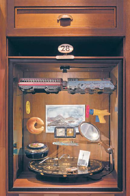 對應(yīng)著小說的第28章“物件給予的安慰”。從圖片可以看出展品包含的不同物件,如玩具火車,最靠后部的一幅水彩畫,名《紅輪船》,下方的手表,鐘表等不同物件。