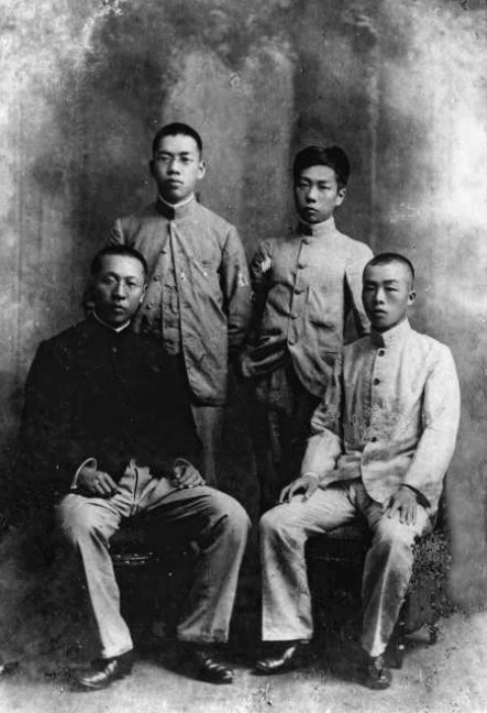 1903年攝于東京,時魯迅在弘文學院。照片上其他三人均為紹興人。與魯迅并排而立者許壽裳,弘文學院浙江班學生;許壽裳前面坐者邵明之,東京清華預備學校學生,后往北海道札幌地方工業專門學校學習土木工程;魯迅之前為陳儀,日本成城學校學生,后就讀于日本陸軍大學,曾任臺灣省行政長官兼臺灣省警備總司令部總司令、浙江省省長。