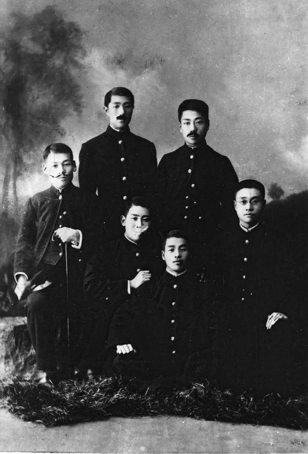 1905年秋攝于日本仙臺。魯迅與同住在“宮川宅”公寓的五名住宿學生在仙臺東一番丁照相館合影。前排左起:三宅、磯部浩策、吉田林十郎、施霖;后排左起:大家武夫、魯迅。這張照片是魯迅贈給公寓主人宮川信哉留念的。八年后的1913年,當時照片中的一個人回來拜訪房東宮川信哉,宮川想象其中三人拍完照片十年后的樣子,為他們添上了胡子。他還在照片的背面寫道:“明治三十八年X月影,拾年后想象髪,大正二年現在,大家君在美國,周君不明,三宅君在大學小兒科,磯部君在米澤縣,吉田君在朝鮮,施君不明。”(“想象髪”是“想象髭”(即胡須)的誤筆。)