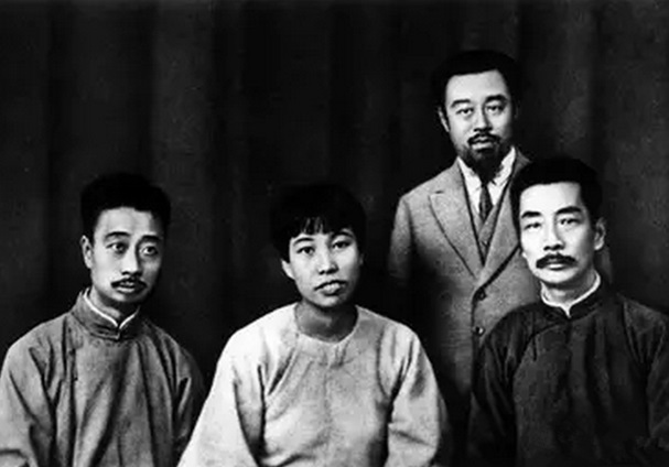 1927年10月4日攝于上海。魯迅到達上海與親朋好友合影。魯迅當日日記中記載:“午前伏園、春臺來,并邀三弟及廣平至言茂源午飯,玉堂亦至,下午六人同照相。”前排右起:魯迅、許廣平、周建人;后排右起:孫伏園、林語堂、孫福熙。值得一提的是,魯迅與林語堂原為好友,后交惡。在1977年文物出版社出版的《魯迅》照片集中,林語堂被抹掉了。在這張照片中,孫福熙與林語堂一同被抹掉。此外,林語堂還在另外兩張照片上也被抹去。