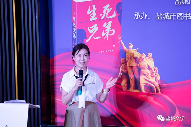 國家一級作家、全國三八紅旗手、書香鹽城形象大使張曉惠在新書分享會上對《生死兄弟》的創作緣由、采寫過程、創作思路及思想感悟進行了深入細致的分享。她飽含深情的講述,既是對文學創作心路歷程的全面回顧,更是對革命先烈的崇高致敬。來自《生死兄弟》主人公陳忠柱、趙敬之家鄉的葛菁,代表家鄉人民向張曉惠獻上了感謝和祝福的鮮花。