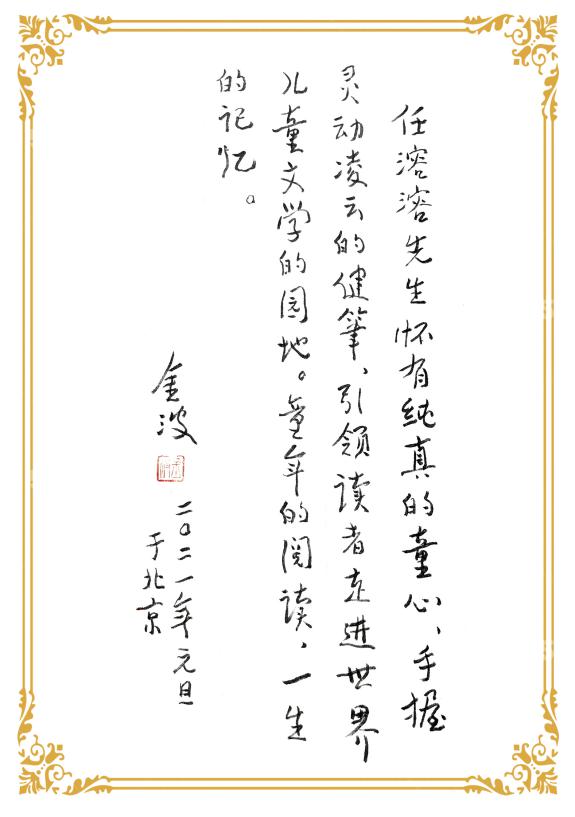 中國作家協會副主席、中國作協兒童文學委員會主任高洪波為該文集題獻:“目光四射的千萬言譯作,將人類文明的精萃,替小朋友們盡情搜羅,于是我們開心地觸摸一顆不老的頑皮靈魂,如何在語言迷宮里穿梭,童心與詩心如何鑄成不朽的快樂星座。”詩人、兒童文學作家金波為譯文集題寫的推薦語這樣說:“任溶溶先生懷有純真的童心,手握靈動凌云的健筆,引領讀者走進世界兒童文學的園地,童年的閱讀,一生的記憶。”“童話融通世界,童心照耀人間。”國際兒童讀物聯盟(IBBY)主席張明舟也題詞祝賀任溶溶譯文集付梓出版。