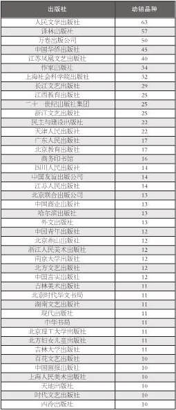 從動銷品種看(見表 1),人民文學出版社的魯迅著作鋪陳魯迅思想成果,以63種動銷雄踞榜首;譯林出版社的魯迅著作再續文學經典輝煌,其動銷品種為 57種;萬卷出版公司的魯迅著作以魯迅文集為主要形式,動銷品種為50種,位列第三。中國華僑出版社等10 家出版社的魯迅著作動銷品種為20~50 種;廣東人民出版社等 31 家出版社的魯迅著作為10~20種。