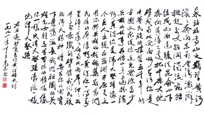 還有一條橫幅,是光年手書的《黃河頌》木版水印件。這是光年為慶祝由巴金任會(huì)長的上海文學(xué)發(fā)展基金會(huì)成立而寫的。全文200余字,一氣呵成,篇尾注明:右應(yīng)邀抄錄舊作黃河頌歌詞 一九九一年十二月光未然。有書法家說,這是他歷年所見光年書法中最好的一幅,筆筆蒼勁雄健,力透紙背,字字筆酣墨飽,神采飛揚(yáng),氣勢豪放,如黃河之水,洶涌澎湃,驚濤萬丈。