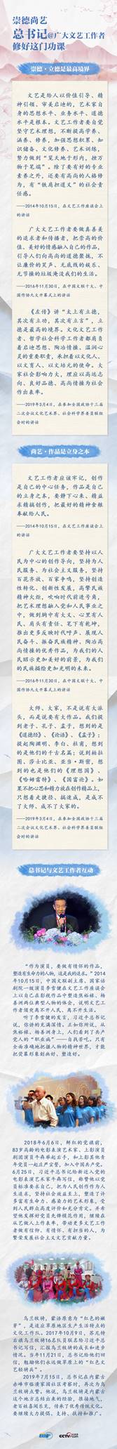 黨的十八大以來,總書記多次寄語廣大文藝工作者,要求大家把崇德尚藝作為一生的功課,努力追求真才學、好德行、高品位,做到德藝雙馨,成為先進文化的踐行者、社會風尚的引領(lǐng)者。