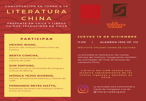 2021年12月16日,智利“中國文學讀者俱樂部”在位于智利圣地亞哥市中心的“智中文化協會”新辦公室正式掛牌揭幕,并舉行了首場活動“中國文學對話會”。智中文協主席、前智利駐華大使雷耶斯·馬塔教授、辛普雷門特出版社社長莫妮卡·特霍斯、雷特拉里亞出版社社長貝爾塔·貢恰、智中文化藝術中心主席胡安·卡洛斯·拉米雷斯和雷斯基金會主席卡洛斯·雷耶斯等現場出席了活動,北京語言大學拉美研究中心主任、阿根廷國會大學教授孫新堂線上參加。活動當天進行了直播,有60多位讀者線上參加了活動。