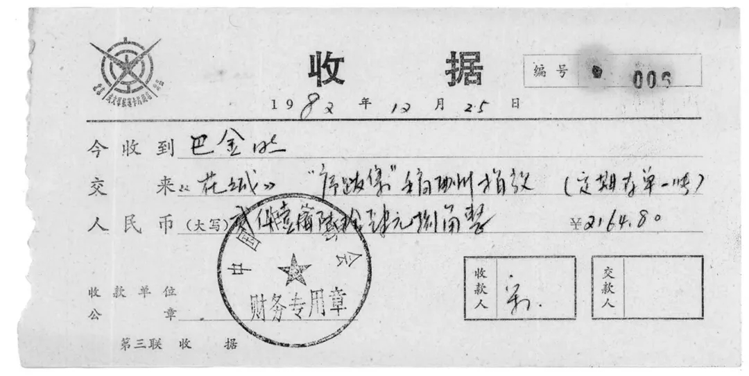 巴金曾叮囑主持四川人民出版社工作的侄子李致:“以后不要再給我寄稿費了。今后所有我的著譯的稿酬,新出的書如《回憶與探索》和十卷本《選集》的全部稿費一律贈現代文學館,已出各書如有再版的機會,稿費也送給文學館(蕭珊的譯著也包括在內)。以后請一定照辦。”[43]在1985年和1986年巴金給文學館楊犁館長的信中也多次談到捐贈稿費的事情,[44]巴金故居藏有一份“巴金同志捐款清單”,內容如下: