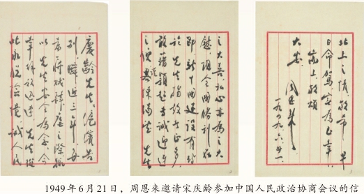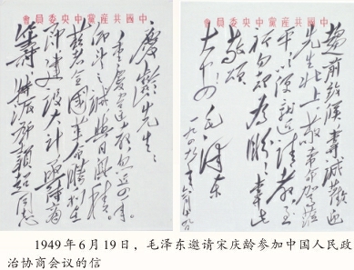 1949年1月19日,毛澤東、周恩來聯(lián)名致電在上海的宋慶齡:“中國革命勝利的形勢已使反動派瀕臨死亡的末日,滬上環(huán)境如何,至所系念。新的政治協(xié)商會議將在華北召開,中國人民革命歷盡艱辛,中山先生遺志迄今始告實現(xiàn),至祈先生命駕北來,參加此一人民歷史偉大的事業(yè),并對于如何建設(shè)新中國予以指導(dǎo)。”一個月后,宋慶齡復(fù)函感謝中共中央邀請:“請接受我對你們極友善的來信之深厚的感謝。我非常抱歉,由于有炎癥及血壓高,正在診治中,不克即時成行。但我的精神是永遠(yuǎn)隨著你們的事業(yè)。我深信,在你們英勇、智慧的領(lǐng)導(dǎo)下,這一章歷史——那是早已開始了,不幸于二十三年前被阻——將于最近將來光榮的完成。”宋慶齡不愿前往北平一方面由于身體原因,另一方面是孫中山先生歿于北平,她曾對好友廖夢醒說過:“北平是我最傷心之地,我怕到那里去。”