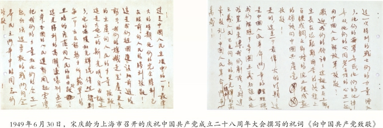 1949年5月27日,上海解放,宋慶齡感到由衷的歡喜,她愉悅地感嘆:“我們現(xiàn)在總算可以自由地呼吸了!”上海解放后,陳毅親自到宋慶齡的住所拜訪,并誠懇地向她咨詢接管上海的建議。6月15日,新政協(xié)籌備會第一次全體會議在北平召開,籌建新政府的各項工作逐步啟動,25日,奉中共中央之命,鄧穎超攜帶著毛澤東、周恩來邀請宋慶齡的親筆信,由廖夢醒陪同,專程抵達(dá)上海。毛澤東在信中寫道:“慶齡先生:重慶違教,忽近四年。仰望之誠,與日俱積。茲者全國革命勝利在即,建設(shè)大計,亟待商籌,特派鄧穎超同志趨前致候,專誠歡迎先生北上。敬希命駕蒞平,以便就近請教,至祈勿卻為盼!專此敬頌大安!”這封信很短,但每句話都包含了濃重的敬意,此外,這封信沒有一處勾畫、一個墨點,顯然經(jīng)過認(rèn)真謄寫,是一幅珍貴的“毛體書法”精品。鄧穎超一同送去周恩來的信中寫道:“慶齡先生:滬濱告別,瞬近三年,每當(dāng)蔣賊肆虐之際,輒以先生安全為念。今幸解放迅速,先生從此永脫險境,誠人民之大喜,私心亦為之大慰。現(xiàn)全國勝利在即,新中國建設(shè)有待于先生指教者正多,敢藉穎超專誠迎迓之便,謹(jǐn)陳渴望先生北上之情。敬希早日命駕,實為至幸。耑上,敬頌大安。”周恩來這封信卻有一處修改,將“略陳”改為了“謹(jǐn)陳”,一字之變,更添敬意。宋慶齡讀完來信深受感動,毅然決定同意北上。6月30日,在上海市舉行的慶祝中國共產(chǎn)黨成立二十八周年大會上,宋慶齡發(fā)表了熱情洋溢的祝詞《向中國共產(chǎn)黨致敬》:“歡迎我們的領(lǐng)導(dǎo)者——這誕生在上海、生長在江西的叢山里、在二萬五千里長征的艱難困苦中百煉成鋼、在農(nóng)村的泥土里成熟的領(lǐng)導(dǎo)者。向中國共產(chǎn)黨致敬!”