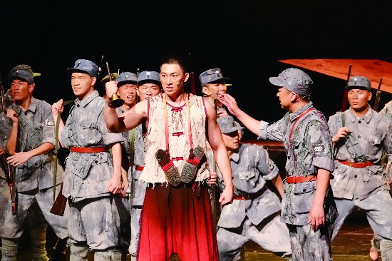 二、探索紅色基因的浪漫表達。近年來作為舶來品的音樂劇在貼近時代、貼近都市年輕人生活、實現本土化轉化和探索市場化運營方面都有了可喜收獲。在慶祝建黨百年的主題創作中,《壯士》的主創團隊在廓清、抓準了平山老兵們的歷史壯舉和精神譜系之后,針對音樂劇藝術特點及藝術表現需要設定人物性格,結構故事框架,鋪排戲劇主線,提煉深化主題,確定了該劇浪漫史詩的呈現風格。全劇集中筆墨營造各種典型戰爭環境、戰斗場面和慘烈犧牲的氛圍,在主、次表演區均突出表現了平山子弟兵告別故土、悲壯出征,奮勇殺敵、無畏犧牲,南泥灣大生產、學習文化、政治培訓,南征北返,告別延安平山籍烈士碑,迎戰祁連山風雪,憧憬新中國誕生等一系列戲劇化場景,塑造了主人公“平山”從一個農民士兵,身經百戰,浴火成長為八路軍連長,為掩護戰友阻擊日寇壯烈殉國的英雄典型。劇中“通訊員”接過平山連長的嗩吶,也成為連長率領戰士繼續征戰,彰顯了“平山老兵精神”的巨大感召力。女兵“教員”作為與平山一起離家出征的“女壯士”,不僅用個人的情感之愛呵護著平山這個同鄉英雄,還用學文化、悟思想的革命博大之愛,讓平山壯士們從內心明白為誰而戰,為誰犧牲的革命道理。