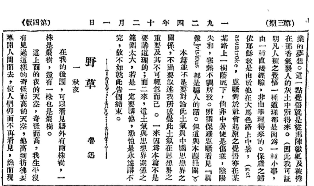 《野草·秋夜》初刊本,《語絲》第三期第四版,1924年12月1日