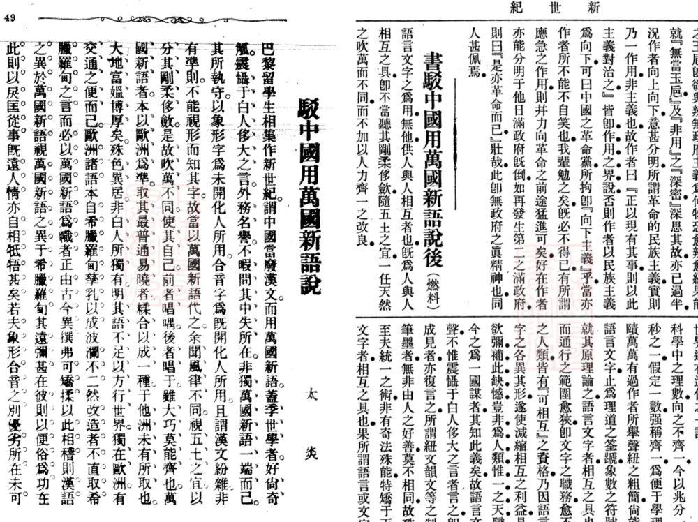 1908年,章太炎和吳稚暉等人就“萬國新語”問題展開論戰,圖為章太炎《駁中國用萬國新語說》和吳稚暉《書駁中國用萬國新語說后》,分別發表于該年《民報》21期和《新世紀》第57期