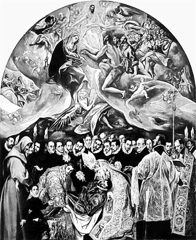 在西班牙小城托萊多,有一個中世紀教堂,名叫圣托梅,無數游客去那里瞻仰格列柯的畫作《奧爾加斯伯爵的葬禮》。這幅畫描繪了兩位圣徒安葬奧爾加斯伯爵的一幕。畫面上部天堂,下部塵世。遺體降下地面,靈魂飛升天堂。奧爾加斯伯爵是一位西班牙貴族,1323年埋葬在圣托梅教堂,在1580年代,教區牧師委托畫家格列柯來描繪伯爵的葬禮和圍繞它而產生的傳說。據說奧爾加斯伯爵下葬時,圣奧古斯丁和圣斯蒂芬從天上出現,幫助吊唁者埋葬他。