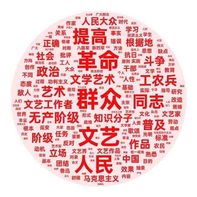 上圖是以中國文明網發布的毛澤東同志《在延安文藝座談會上的講話》為文本內容,通過詞頻分析生成的文字云圖。