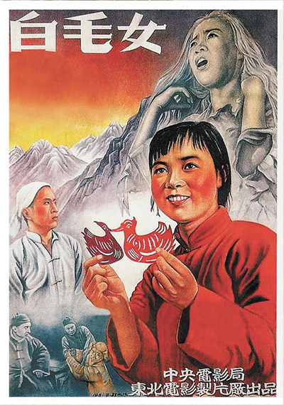 電影《白毛女》海報(bào)由享有“海報(bào)泰斗”之譽(yù)的顏地先生繪制,是一幅水粉畫。海報(bào)對(duì)比鮮明,濃縮了影片精華。畫面前景為暖色調(diào),喜兒身穿紅色棉襖、手拿自己剪的一對(duì)紅色鴛鴦窗花,紅潤的臉龐笑容洋溢,還有一頭烏黑亮麗的秀發(fā),整個(gè)人活潑可愛。背景則為冷色調(diào),從雪山洞窟出來的“白毛仙姑”披頭散發(fā),雙手回抱在肩,口張大、眉頭緊鎖,表情痛苦。冷色調(diào)與暖色調(diào)、黑頭發(fā)與白頭發(fā)、可愛與恐怖,這種對(duì)比的手法,深刻揭示出“舊社會(huì)把人逼成‘鬼’,新社會(huì)把‘鬼’變成人”的主題,給觀眾留下強(qiáng)烈的心靈震撼。