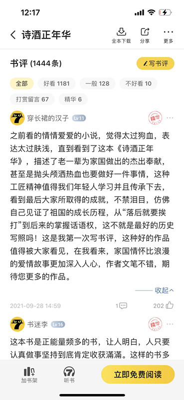 棠花落:要說最滿意的,其實是什么獎都沒有拿到的《詩酒正年華》。這是我付出心血最多的一部作品,篇幅也是最長的。它的故事性,是四部現實題材作品中我最滿意的,連載的時候有很多讀者反饋,留言區里最年長的讀者是“50后”。
