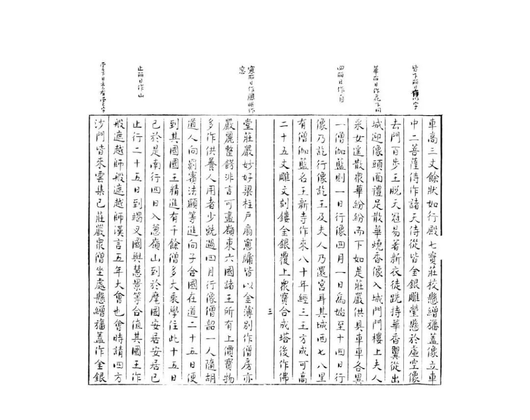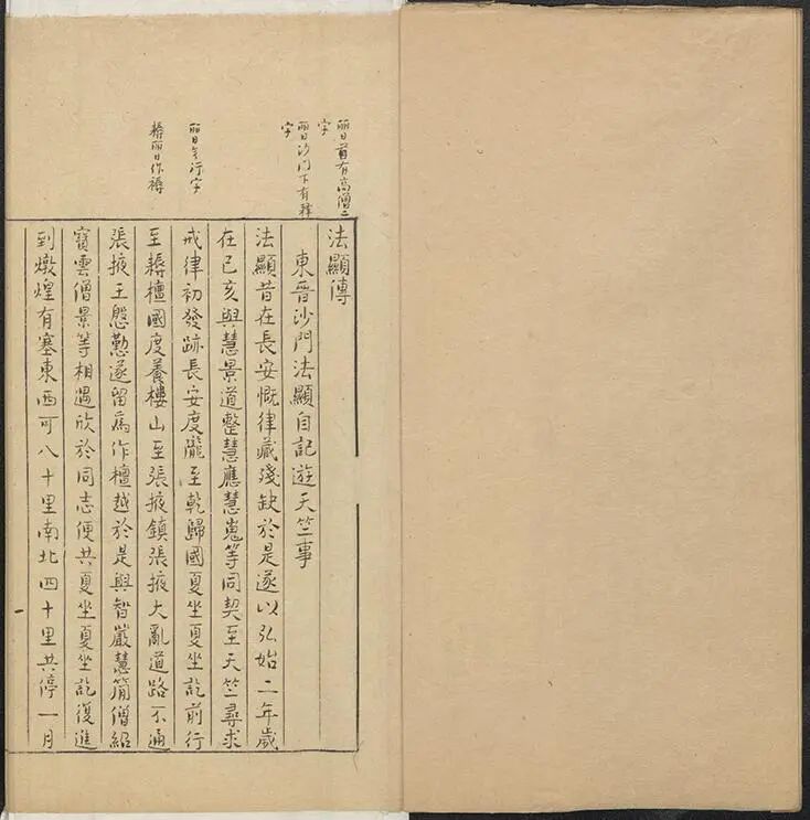 在建康道場寺,僧人請法顯寫出游歷天竺的經過,于是有了這部《法顯傳》。傳后有一段記錄者所寫的跋文,引述法顯的自評道:“顧尋所經,不覺心動汗流,所以乘危履險,不惜此形者,蓋是志有所存,專其愚直,故投命于不必全之地,以達萬一之冀。”并高度贊揚法顯的志業和精神:“于是感嘆斯人,以為古今罕有。自大教東流,未有忘身求法如顯之比!”