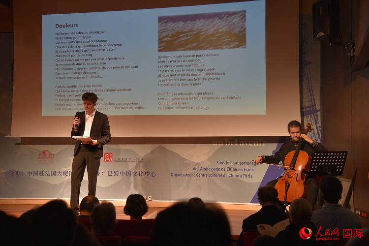 法國青年演員凡維登在悠揚的琴聲中朗誦中文詩歌的法語翻譯版。人民網記者 劉玲玲攝