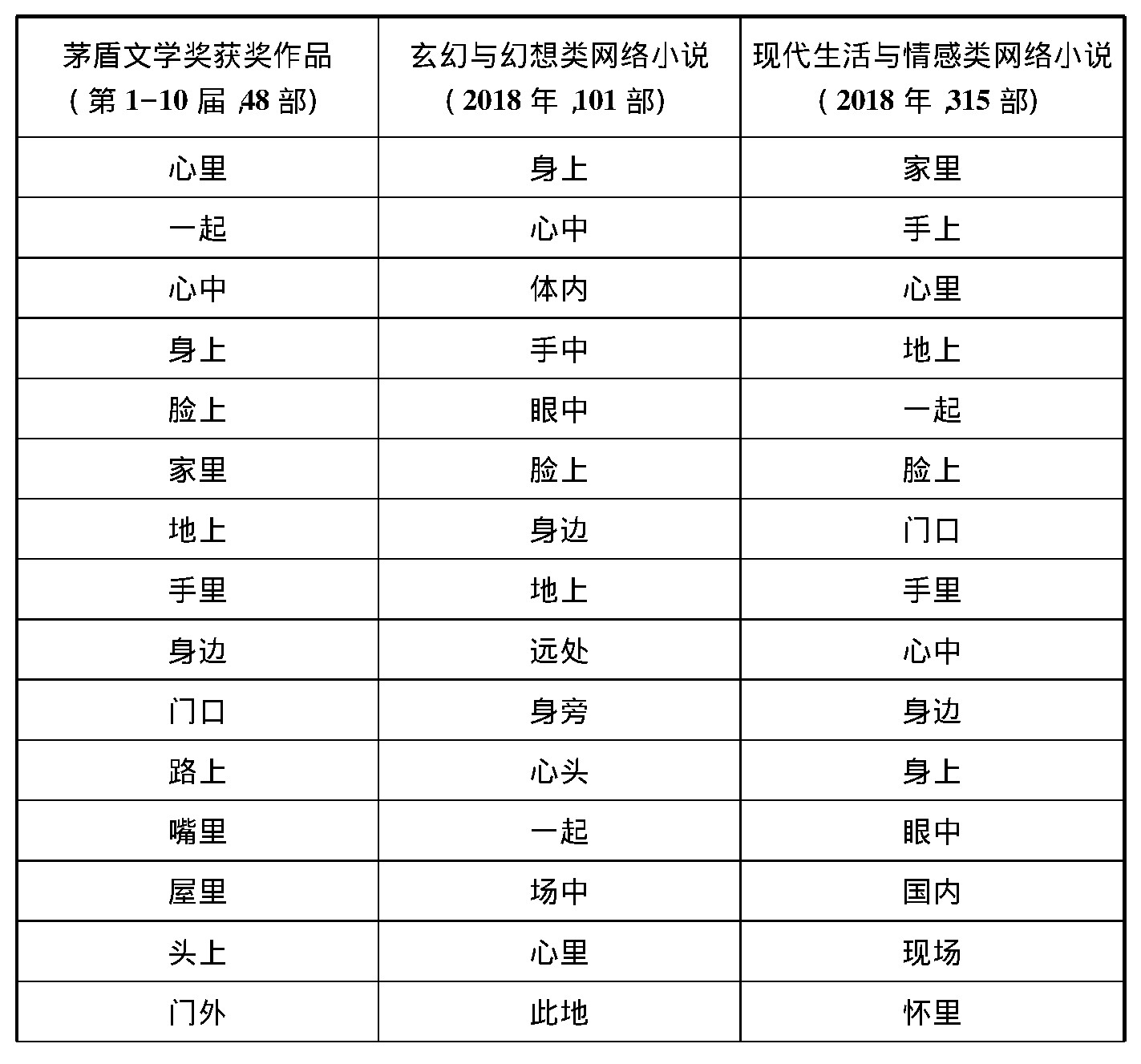 在歷屆茅盾文學(xué)獎獲獎作品的場景高頻詞統(tǒng)計結(jié)果中,一方面,“心里”是當(dāng)之無愧的第一高頻詞,在統(tǒng)計數(shù)值上遙遙領(lǐng)先于后面其他場景的高頻詞4,而且其近義詞“心中”也排在第三位。另一方面,具體到針對每部獲獎作品的分析數(shù)據(jù)中,我們也發(fā)現(xiàn)“心里”作為場景高頻詞普遍排位較高的情況,其中“心里”作為第一場景高頻詞的作品有28部,作為第二場景高頻詞的作品有10部,作為第三場景高頻詞的作品有2部,此外還有2部作品的第一場景高頻詞為“心中”———即“心里”的同義詞。5而在2018年中國101部玄幻與幻想類網(wǎng)絡(luò)小說的場景高頻詞統(tǒng)計結(jié)果中,“心里”的次序則比較靠后(僅為第14位),而與其意思相近的“心中”“心頭”排名則相對靠前,分別為第2和第11位。在2018年中國315部現(xiàn)代生活與情感類網(wǎng)絡(luò)小說的場景高頻詞統(tǒng)計結(jié)果中,“心里”和其近義詞“心中”則分別位列第3和第9。