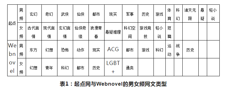 網絡文學在Webnovel上的“亮相”呈現出直接顯性的東亞化與國際化特點。在題材分類上,Webnovel選用了英文讀者較為熟悉的類型小說分類,且在一定程度上呼應世界新興審美價值取向(見表1)。