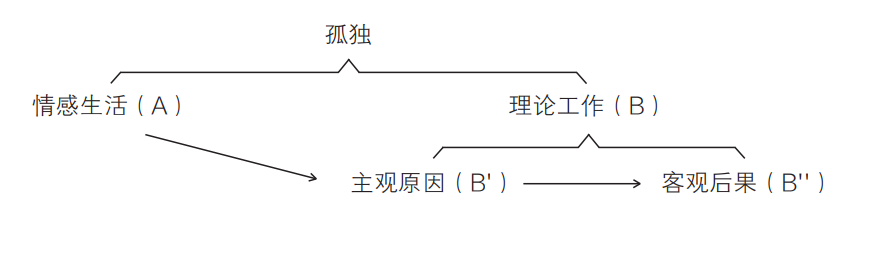 在《來日方長》里,孤獨的主題實際上具有雙重的悖論性。它把一個共同的結構不僅賦予了阿爾都塞的情感生活(A)和理論工作(B)這兩個不同的方面,而且賦予了理論工作的私人、主觀的原因(B′)和公共、客觀的后果(B″)這兩個不同的領域。我們在“最偉大的哲學家都是天生沒有父親的”那段話里所指出的“巨大的跨越”,并非發生在A和B之間,而是發生在A→B′和B″之間,即主體和完全在其主觀性之外所發生的事情之間: