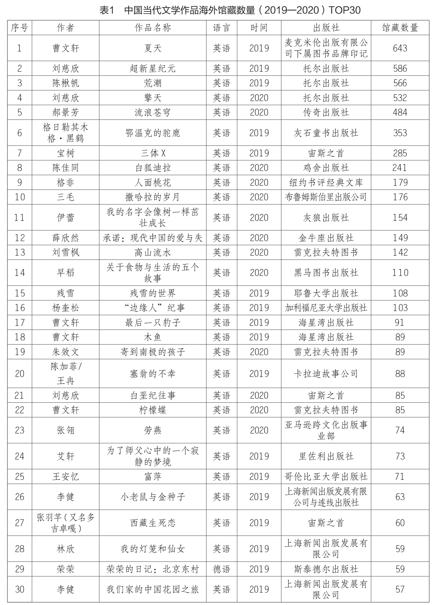 筆者在2021年6月至8月,用近兩個月的時間依托于世界圖書館聯機書目數據庫(OCLC)、日本情報研究所(Cinii Books)、JSTOR電子書數據庫、世界主要媒體數據庫(News Bank)、道瓊斯媒體數據庫(Factiva)、亞馬遜網與Goodreads等專業數據庫與互聯網平臺,搜集和梳理了2019—2020年近100部中國當代文學作品的海外館藏數據、讀者反饋和專業媒體報道數據,從海外館藏(傳播范圍)、媒體書評或同行評價、讀者反饋等三個維度,對2019—2020年中國當代文學海外傳播情況進行了全方位分析,具體情況如下。