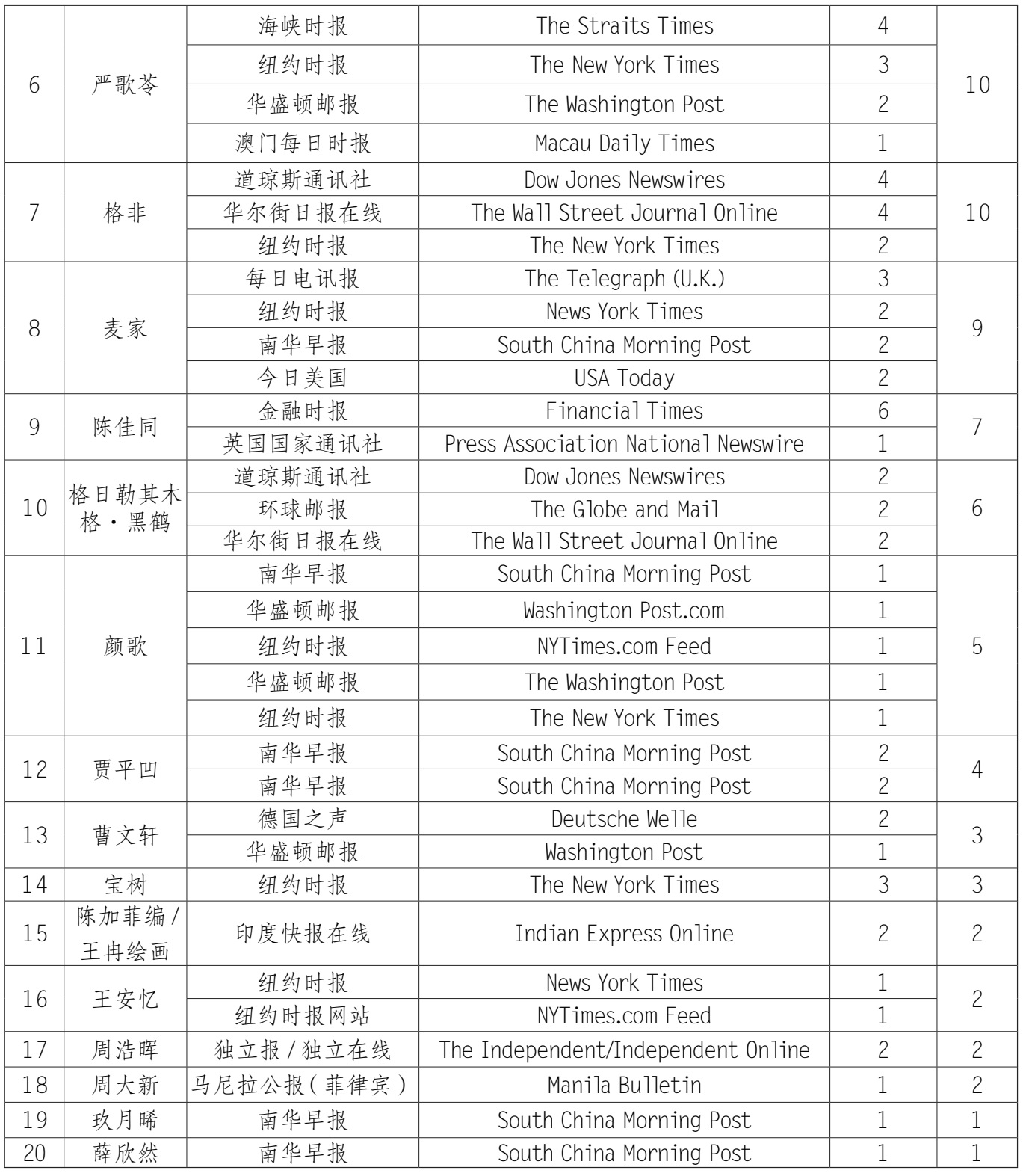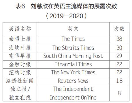 如《紐約時報》,第一次以“《三體》為美國科幻小說迷換口味”為題,在2014年11月10日刊發了正面書評,認為“目前美國的很多頂尖科幻小說作家摒棄傳統的外星人入侵情節,更青睞反映現實世界的題材,諸如氣候變化和性別轉變之類”,而《三體》是第一部講述異于地球的三體人文明與地球人互動的故事,這種不同文明之間沖突的故事會更受美國讀者的青睞。此后有關劉慈欣《三體》的書評分別出現在英國《衛報》《每日電訊》《海峽時報》,美國《華爾街日報》《芝加哥論壇報》《大西洋月刊》《紐約客》《洛杉磯時報》,美國公共廣播電臺、美國康納仕集團GQ雜志,澳大利亞《悉尼先驅晨報》《澳大利亞人報》,印度快報雜志等主流媒體,以及專業科幻類雜志,如軌跡(Locus)雜志、網站,專業科技類雜志有線(WIRED)雜志、網站,專業物理空間雜志《物理學(Phys)》、網站等近200多家主流大眾媒體與科學幻想類、物理學類等專業媒體。依據Factiva 數據庫在2021年8月的份檢索,得到劉慈欣在2019至2020年兩年在英語世界的主流媒體展露次數,見表6。
