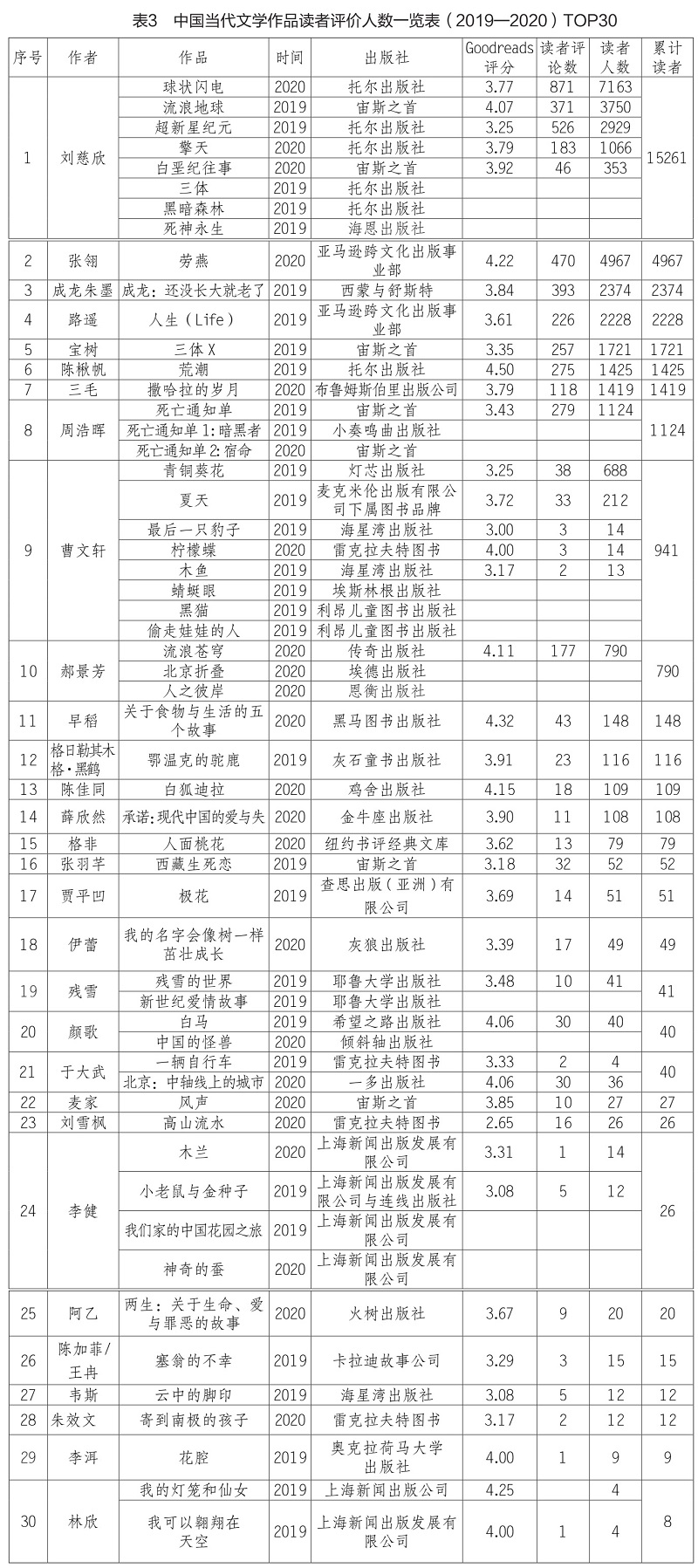 評估研究的海外館藏基礎數據來源于OCLC(Online Computer Library Center)的World Cat世界圖書館聯機書目數據庫,并輔以日本CINII數據庫與JSTOR電子書數據庫的書目數據,彌補OCLC數據偏重歐洲、北美地區的不足。以“translated from Chinese”為關鍵詞進行檢索,時間限定為“2019—2020”,以海外館藏超過3家為參考標準,遴選了96部中國當代文學作品,參見表1 TOP30排行榜。媒體評價數據來源于世界主要媒體數據庫和道瓊斯媒體數據庫,時間限度為2019至2020年,參見表2。TOP20排行榜。讀者評價數據依托于亞馬遜網與Goodreads平臺,時間限度為2019至2020年,詳情見表3 TOP30排行榜。