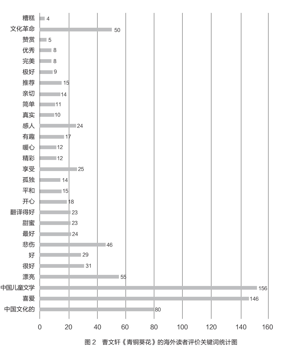 此外,在兒童文學領域中,曹文軒的8部上榜作品,累計讀者941人次,排在該領域首位。以其中名氣最高、閱讀人數最多的作品《青銅葵花》為例。截至2021年8月,曹文軒的《青銅葵花》在Goodreads上的評分達到4.1分,參與打分的人數近千人,讀者評論數180條,其中評論字數超過100個詞的達到近100條,超過500個詞的有10條,3條評論超過1000個詞。2021年8月通過關鍵詞詞頻統計發現:156名讀者留言中提到了“中國兒童文學”,其中“喜愛”頻次為146次,“中國文化的”為80次,可以想見,海外讀者對于《青銅葵花》的接受態度是相當高的。詳情見圖2。總之,無論是以《三體》為代表的中國科幻文學,還是以《青銅葵花》為代表的中國兒童文學,都已經在進入世界主流文壇且受到讀者廣泛關注,中國當代文學的海外傳播取得了一定的成績。