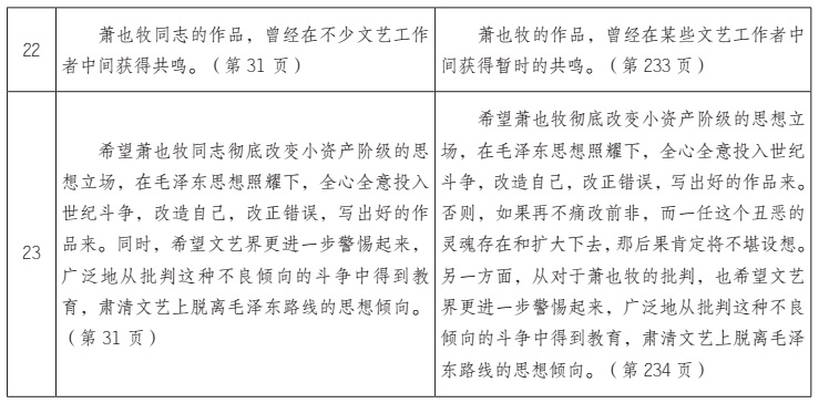 編號23的修改,屬于增加內容。這種增加內容的方式,使得行文的論述得到進一步加強。康濯在文章結尾處,表達了對蕭也牧的真誠期待,切合了1951年全國文藝界開展對蕭也牧文藝創作批判的政治目的:“治病救人。”但是,在1959年初版時,康濯把蕭也牧內心深處最壞的打算帶來的后果表達了出來,認為蕭也牧“如果再不痛改前非,而一任這個丑惡的靈魂存在和擴大下去,那后果肯定將不堪設想”。也就是說,蕭也牧抵抗文藝界批判他的思想如果存在,這證明蕭也牧有一個“丑惡的靈魂”。按照后來蕭也牧的定性,這證明蕭也牧內心深處有一個“丑惡的靈魂”存在,他成為反黨反社會主義的階級敵人,是右派分子中最壞的右派分子。這種文字修改,明顯是一種政治恫嚇語氣的具體體現,此語氣是當時大多數批判文章都具備的、特殊的時代屬性。