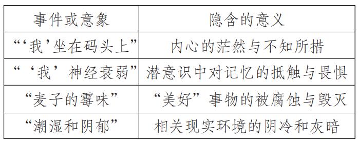 其次,是故事的反復能力與敘事的反復能力之間的關系,也就是熱奈特所謂敘事上的“頻率”問題。在一部敘事作品中,經常會發生這樣的現象,故事時間中,發生了n次的事情,或出現了n次的意象,在敘事時間中,卻只敘述了一次。與此相反的情況是,故事時間中一件事情雖然只發生了一次,或同一個意象,在敘事時間中卻被多次提及。當某一事件按照一定的規律在作品中反復出現時,無形中就為小說的敘事賦予了一種和諧而穩定的音樂節奏,我們可以稱之為音樂的主導動機,實際上,也就構成了一種“頻率”。它們通常或者表現為一些簡短的語言表達,或者是具有象征意義的意象,在作品中被有意地重復著,而每次的出現都能夠被讀者很快地辨認出來,并引發聯想。《民謠》中,就有很多同一事件或意象反復出現的現象,比如,“王大頭在碼頭上坐著”“‘我’神經衰弱”“麥子的霉味”“潮濕和陰郁”等,所有這些都是在小說中曾經多次出現的描述。如果對以上這些事件或意象進行如下分析。