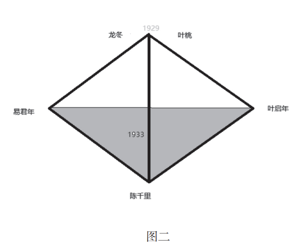 而如果我們進一步引申的話,這里其實還存在著另一組人物關系三角形——葉啟年、陳千里和易君年。20世紀20年代中期,還在大學任教的葉啟年和大多數(shù)中國知識分子一樣,也在思考富國強兵、振興中華的道路。此時,葉啟年正信奉無政府主義思想,并物色優(yōu)秀的年輕人團結在自己身邊。陳千里和易君年都是葉啟年選中的青年學生,只不過在時代大潮的推動下,兩個人選擇了截然相反的人生道路。陳千里受到葉桃的影響,認識到葉啟年的“虛無主義背后,躲著一個投機分子、野心家”[13],轉而接受了共產主義思想;而易君年則不斷追隨導師葉啟年,先是潛伏在中共廣州地下組織內,行動成功后,繼而利用龍冬的身份,打入中共上海地下組織。從這個角度看,這部小說的情節(jié)人物結構,也可以看作一個類似于三棱錐的立體結構,葉啟年、陳千里和易君年在1933年初圍繞“千里江山圖”計劃展開的對決,構成了這個三棱錐的底面;他們的行動最終都指向了歷史(也就是三棱錐的頂點),即1929年死去的龍冬和葉桃(見圖二)。