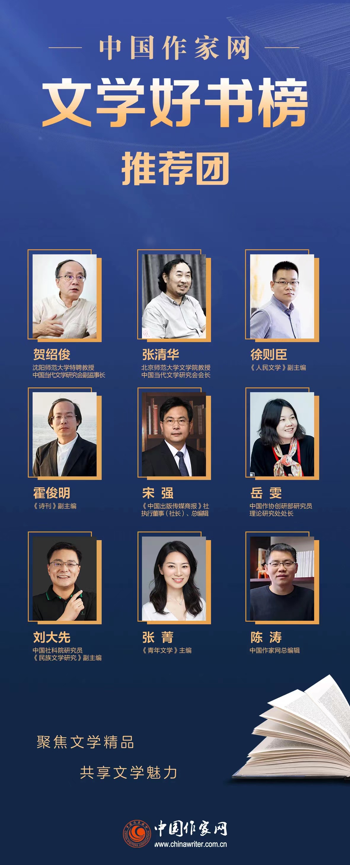 “中國作家網(wǎng)文學(xué)好書榜”評選范圍僅限文學(xué)類作品,每兩個月評選一次。賀紹俊、張清華、徐則臣、霍俊明、宋強、岳雯、劉大先、張菁等深耕于文學(xué)現(xiàn)場的作家和評論家、媒體人,組成好書榜推薦團,以全面開放的視野、專業(yè)創(chuàng)新的眼光,發(fā)現(xiàn)能夠涵養(yǎng)、強健精神的優(yōu)秀作品。我們將從出版機構(gòu)和媒體中廣泛征集參評圖書,推薦團成員在對參評圖書認(rèn)真閱讀的基礎(chǔ)上進(jìn)行定期的討論,從而評選出這兩個月內(nèi)新出版的10部優(yōu)秀中外文學(xué)類圖書,最終結(jié)果將以榜單的形式發(fā)布。年終,將綜合歷次推薦結(jié)果,呈現(xiàn)“中國作家網(wǎng)年度文學(xué)好書榜”。