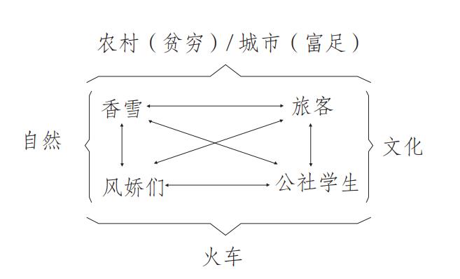 如圖所示,臺兒溝的香雪和鳳嬌們與城市的旅客(列車員)、公社同學處在分化、分離的兩極中。從語義角度看,香雪與旅客之間是一種對立關系,與公社同學之間是一種矛盾關系;鳳嬌們與香雪的公社同學構成對立關系,與旅客構成矛盾關系,她們處在既貧窮又沒有文化熏染的一個極點上。整個文本表意結構建立在臺兒溝與城市之間的二元結構關系上,二者又以火車為中介發生密切關聯,調和矛盾,融合在一起。