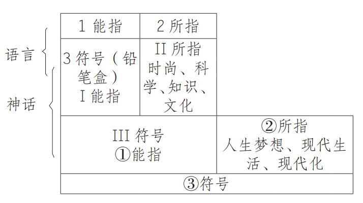 在第一系統中,鉛筆盒只是一個文具用品,體現它的實用功能和價值;在第二系統中,鉛筆盒開始產生認知價值和神話功能,它的磁鐵開關、泡沫塑料等材質和美麗圖案指向科技、知識、文化、時尚等意涵;在第三系統中,它更被賦予人生夢想、現代生活方式、現代化等意識形態意涵。這樣,這個符號有三個系統、五度空間。