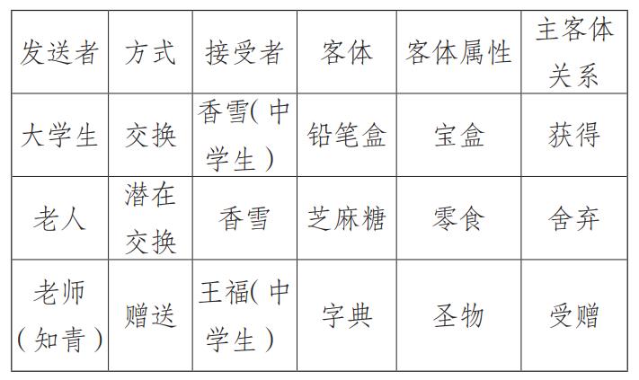 需要申明的是,上文提到香雪單純、溫順、善良、聰慧等感人形象,這是主客體價值論的前提和基礎。“一種價值論必須化身為表層敘述句法中的血肉主體”14,否則無從談起——香雪這個人物形象塑造得成功正是這篇小說魅力之所在,然后才上升為一種“符號學存在”。