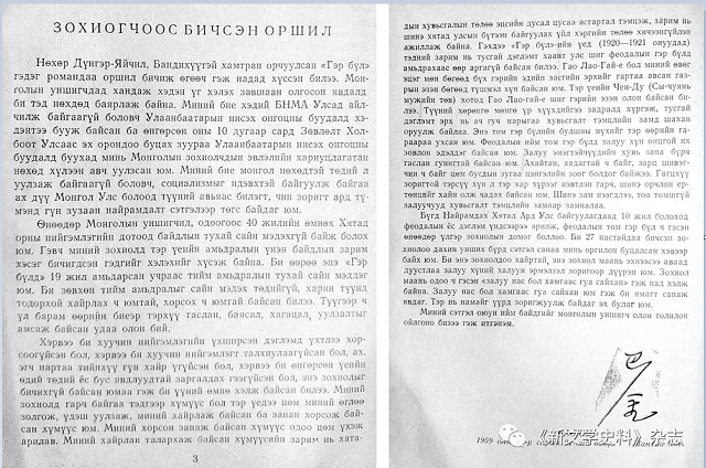 借助互譯器,我花費一天時間用于掃描、校對和翻譯,幾經推敲潤色,才在深夜拿出這份序言譯文的初稿。初次翻譯這個小語種,我缺乏自信,又拜托《新文學史料》編輯部把關(她們找到一位精通蒙古文的學者照日格圖先生進行校譯,增刪訂正)終于完成下面這篇譯稿。