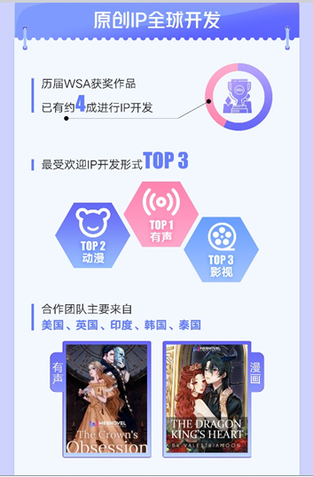 《報告》顯示,歷屆WSA獲獎作品已有約4成進行IP開發,其中,WSA2020冠軍作品《沉淪愛的冠冕》已改編成有聲劇,WSA2021冠軍作品《情迷》已翻譯成韓語在當地上線,另有《龍王的不眠之夜》等多部優秀作品被改編為漫畫。IP開發的合作團隊主要來自美國、英國、印度、韓國和泰國。