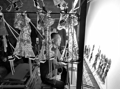 許明堂則專注于皮影表演。他平時說話的聲音不大,給人一種和風細雨的感覺,演出時卻完全像換了個人,雄渾厚重,還有幾分滄桑。許明堂的父親就是一位皮影戲班班主,拉弦、吹笛都很專業。許明堂小時候,每次考完試回家父親不看他的語文數學成績,就看音樂成績。一看音樂成績高就很高興,說這個孩子能唱戲。周末和假期,父親一有演出就把他帶出去。慢慢地,他也被皮影戲所吸引。許明堂說:“要讓觀眾投入到皮影戲里不容易,前提是演員自己要投入,投入的前提是‘熏’,多年的‘熏’。我在表演上對自己要求嚴格,每次演出的時候我都很投入。”許明堂在設備、道具、燈光、挑纖動作這些方面都有改進。在皮影表演的人里,許明堂拿手機最早,用擴音設備也最早。他希望有更多的人能接受、喜愛皮影演出,所以就在細節上下功夫,尤其是挑纖動作。許明堂執著于精細的效果,他希望通過自己與同仁們的努力,能讓更多的人了解并喜歡皮影,也由此了解并喜歡他的家鄉。