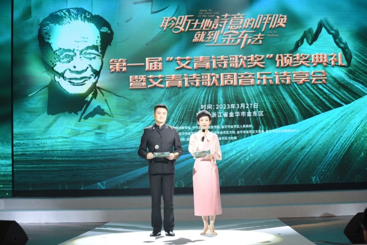 3月27日,以“聆聽土地詩意的呼喚,就到金東去”為主題的第一屆“艾青詩歌獎”頒獎典禮暨艾青詩歌周音樂詩享會在浙江省金華市金東人文博覽中心舉行。