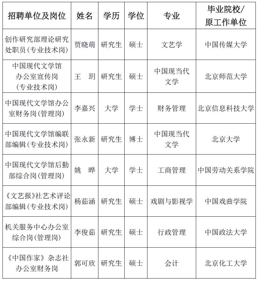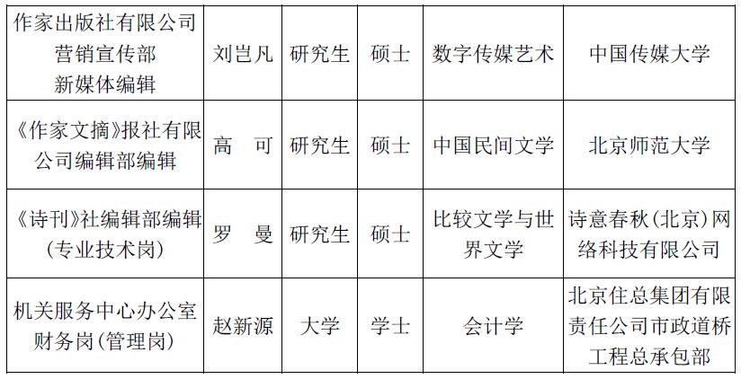 創作研究部綜合處職員崗、魯迅文學院教學研究部職員崗因報名人數未達到開考比例,取消此次招聘計劃。