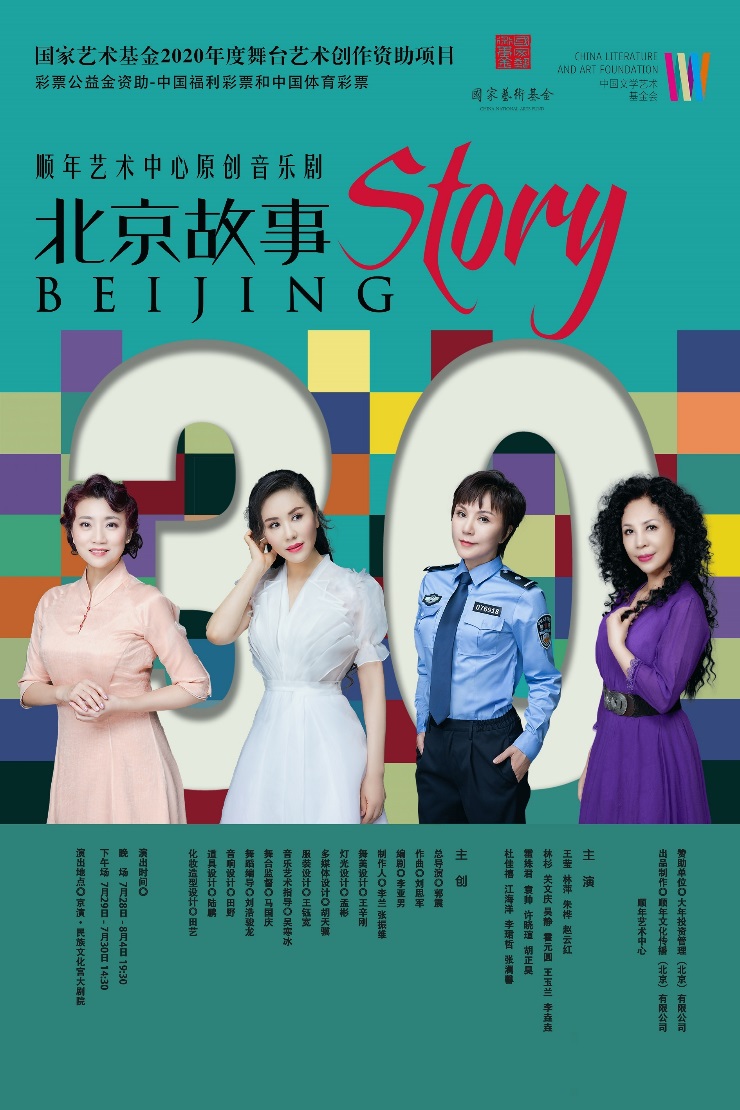 音樂劇《北京故事》由順年文化傳播(北京)有限公司和順年藝術中心聯合出品制作,是彩票公益金資助—中國福利彩票和中國體育彩票、國家藝術基金2020年度舞臺藝術創作資助項目,以及中國文學藝術發展專項基金資助項目。作為一部以現代城市故事為題材并命名的原創音樂劇,該劇以概念音樂劇的創作手法,刻畫了一組中年女性的群像,講述了四位北京大妞兒由一個30年前的約定,引出一場30年后的歡喜相聚。四幀中年女性的人生快閃,呈現了她們為赴30年之約所展開的一系列關于事業、愛情和生活的故事。
