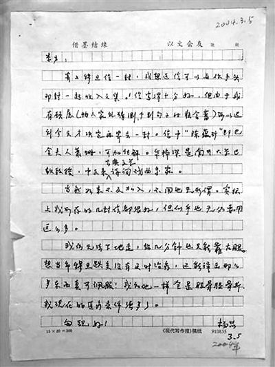 次年2月13日,楊苡老師來信:“附上我在家找到的巫寧坤(西南聯大、芝加哥大學同學、南開大學同事)舊作,供參考。查英傳常來電話,比較細心,我盡可能提供他信息。最近讓他打電話給周定一(西南聯大南荒社、高原社骨干成員),很有幫助。”對如何編好《穆旦詩文集》,楊苡老師作為過來人與當事者,也提出中肯的建議:“我個人以為全集前面的序不宜為僅上三個學者的文章摘抄,畢竟都是學院派的。我以為謝冕的《論中國新詩》(已獲北京三聯文藝評論一等獎)中必有論穆旦的,應當摘錄。還有詩人周良沛寫的(中國新詩穆旦卷卷首)你可能已收到趙蘅寄給你的那本小書‘穆旦詩選’。還有巫寧坤寫的一篇都可以摘取一些,使前面的代序更豐富些,也表示眾口皆碑。所謂‘代序’,也就是用了學者、詩人對穆旦的評價。對了,還有邵詩人(邵燕祥)那篇精彩的發言(已收入邵詩人最近出的集子中)也不能忘記。這樣便有七位著名學者詩人對穆旦的評價。你看對不對?這樣摘抄,我個人認為更能使人耳目一新。”(2004年2月23日信)