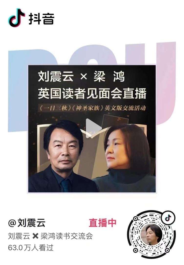 第二天,劉震云、梁鴻一行在倫敦唐人街中國站(China Exchange)舉行讀者見面會。中國作家到訪的消息一經(jīng)發(fā)布,馬上就成為“熱詞”,報名名額被“秒空”,不但現(xiàn)場200多個座位座無虛席,同步開通的抖音直播還吸引了中外63萬名觀眾在線觀看,活動儼然成為中外讀者的一次文學(xué)節(jié)日。通過交流,劉震云、梁鴻把鮮活生動的中國故事以平實、真誠的方式講述出來,拉近了讀者與作家的距離,讓大家感受到了文學(xué)跨越國界、直抵人心的力量。