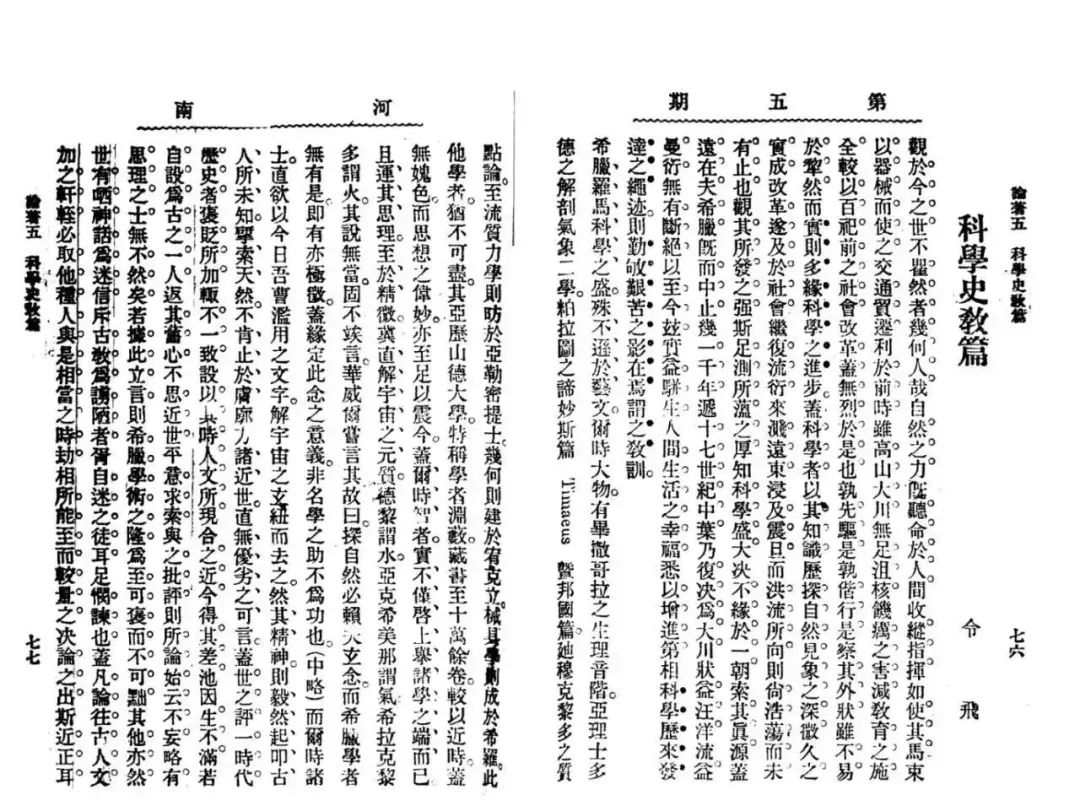《科學史教篇》初發表于一九○八年六月《河南》月刊第五號,署名令飛。